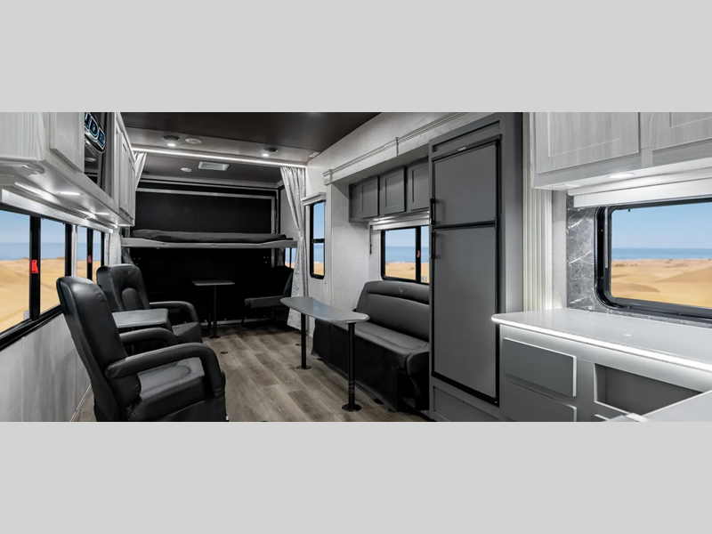 Each model features an 8' 6" wide stance chassis, a Clean Grip lined ramp door, and a 40 gallon fuel station that will make camping with toys easier than ever. There are also Gladiator high speed tires and heavy duty axles with Zerk fittings for smooth towing and hi-def 3M graphics that are sure to turn heads as you enter the campground. Inside, the commercial grade linoleum will be easy to keep clean, and there are 2,500 lb. rated tie-downs to keep your gear secure.
