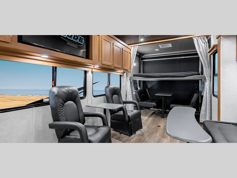 Sleeps 5 Slides 1 Length 37 ft 4 in Ext Width 8 ft 6 in Ext Height 13 ft 5 in Hitch Weight 2380 lbs GVWR 16000 lbs Dry Weight 10360 lbs Fresh Water Capacity 100 gals Grey Water Capacity 50 gals Black Water Capacity 50 gals Tire Size 16" Furnace BTU 30000 btu Generator 4.0K Fuel Capacity 40 gals Number Of Bunks 1 Available Beds Queen Refrigerator Type 12V Axle Weight 7980 lbs Garage Size 21 ft 11 in LP Tank Capacity 30 lbs Water Heater Type On Demand Tankless AC BTU 15000 btu Awning Info Electric w/LED Light Axle Count 2 Number of LP Tanks 2 Shower Type Radius Electrical Service 30 amp Similar Floorplans