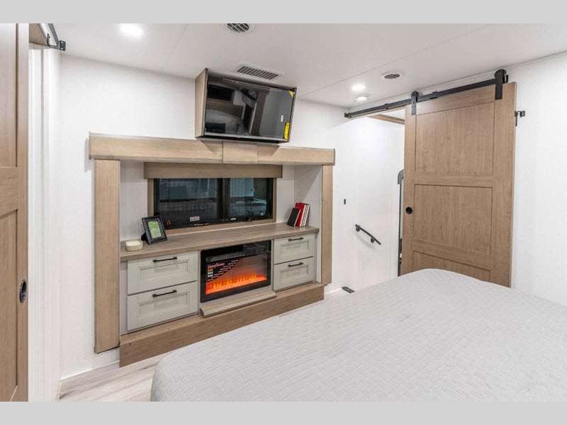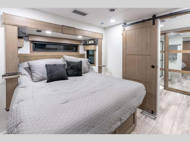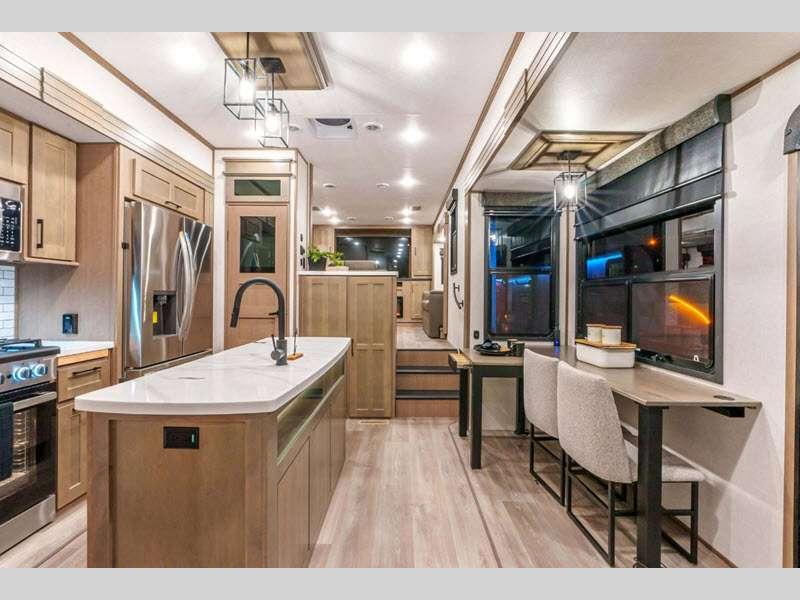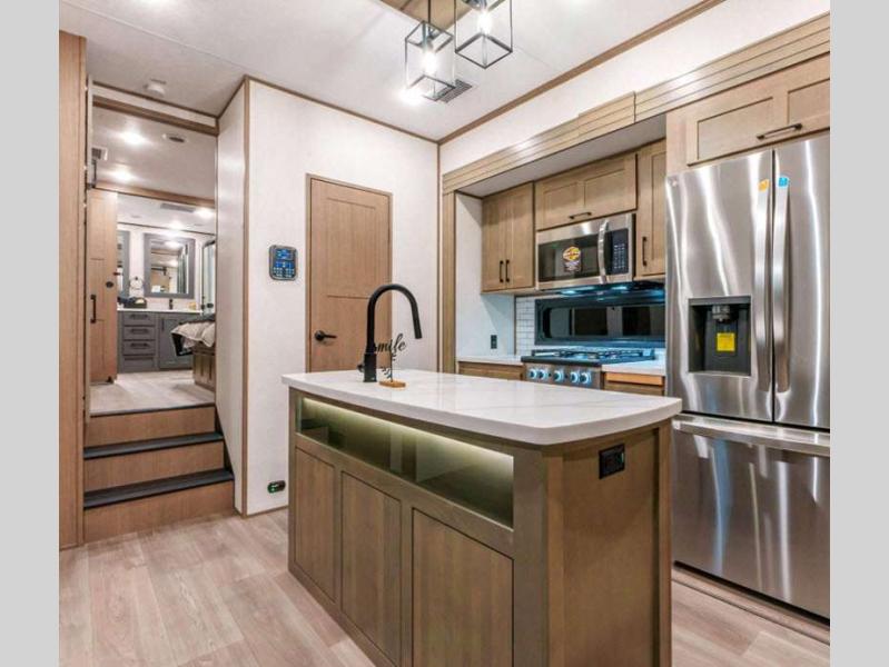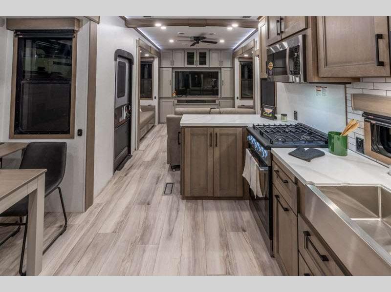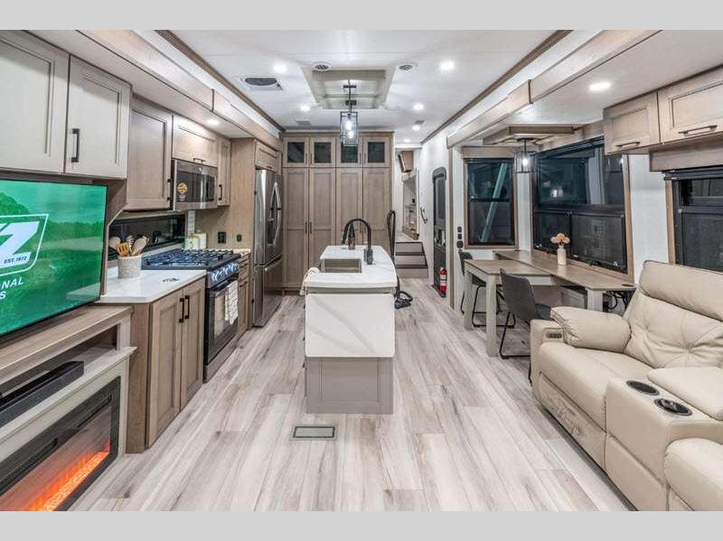 Sleeps 4 Slides 4 Length 34 ft 11 in Ext Width 8 ft 5 in Ext Height 13 ft 6 in Int Height 6 ft 8 in Interior Color Mink, Pebble, Blancher Maple/Morel Fog Exterior Color Black Pearl Full Body Paint Option, Grey Pearl Full Body Option Hitch Weight 2640 lbs GVWR 14995 lbs Dry Weight 12740 lbs Cargo Capacity 2255 lbs Fresh Water Capacity 76 gals Grey Water Capacity 90 gals Black Water Capacity 50 gals Tire Size 17.5" Furnace BTU 40000 btu Available Beds King Refrigerator Type House Refrigerator with 2000W Inverter Refrigerator Size 26 cu ft Convection Cooking Yes Cooktop Burners 4 Shower Size 48" x 30" Number of Awnings 1 Axle Weight 10100 lbs LP Tank Capacity 30 lbs Water Heater Type On Demand Tankless AC BTU 45000 btu TV Info LR 50" Smart LED TV, BR 32" Smart LED TV Awning Info 17' Power w/Fusion LED Light Strip Axle Count 2 Washer/Dryer Available Yes Number of LP Tanks 2 Shower Type Shower w/Seat Electrical Service 50 amp Solar Wattage 400 watts Similar Floorplans