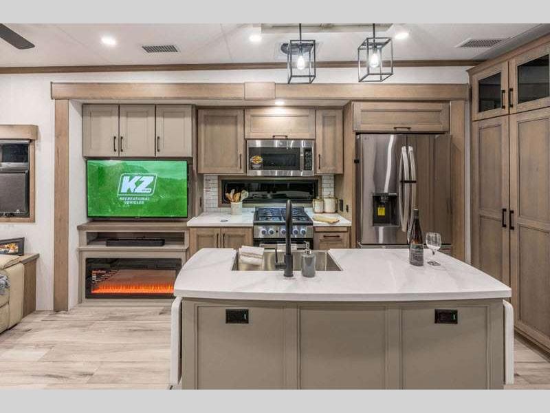 Each fifth wheel is built with 101" wide-body construction, an extra-reinforced heavy-duty front fiberglass cap, and features the All-Weather Insulation Package so you can enjoy camping in all kinds of weather. The six-point hydraulic auto-leveling makes setting up easier, and the KZ Engage Powered by OneControl features an app that you can download to control all of your unit's functions right from your smartphone. The Durango Gold's kitchen is a chef's dream with its 26-cu. ft. house refrigerator with a 2,000W inverter, 30" convection microwave, 24" oven with four-burner range, plus abundant storage!